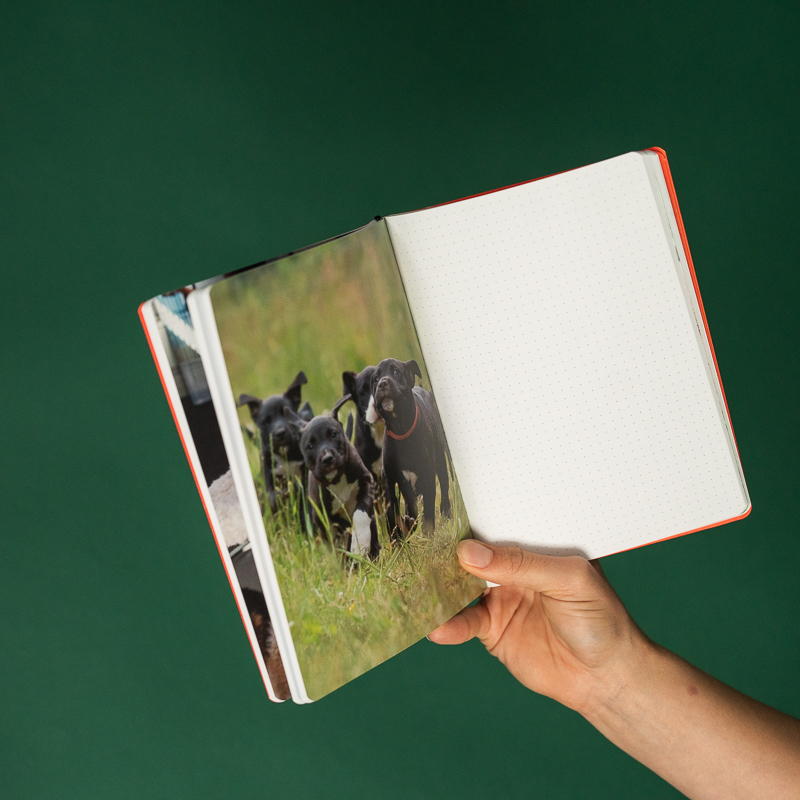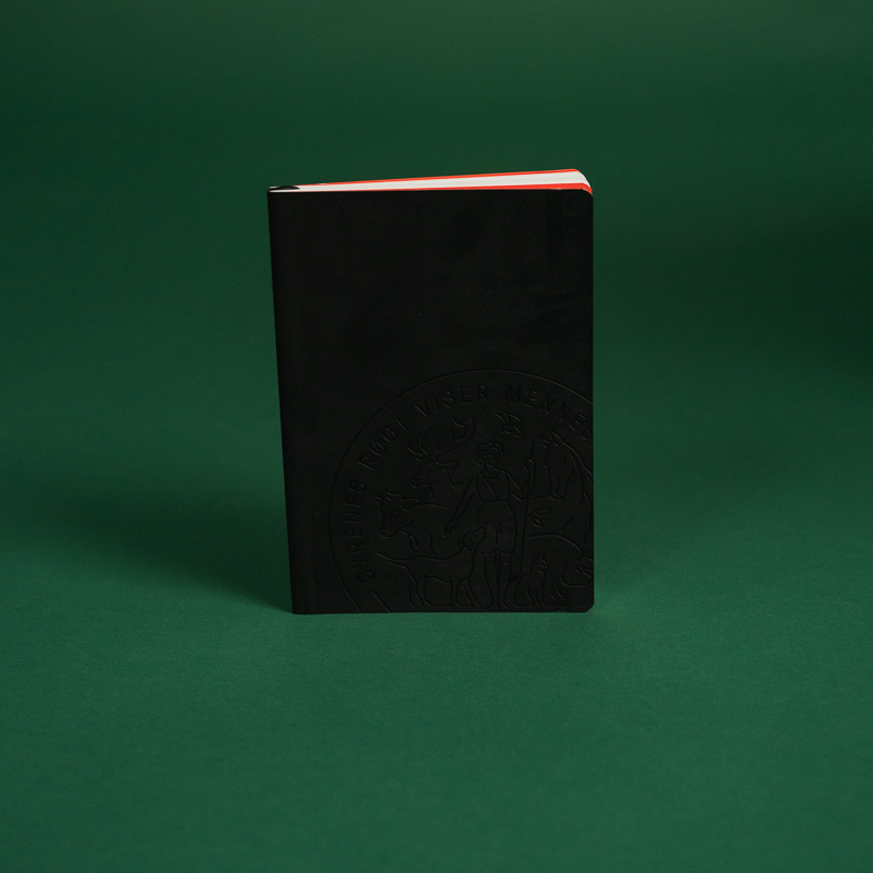 Skøn bullet journal i lækker kvalitet med Dyrenes Beskyttelses emblem i dybdetryk på forsiden.