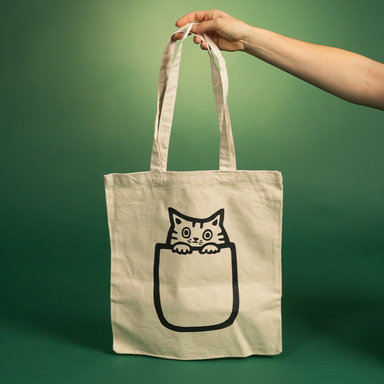Spar miljøet for mere plastik, og genbrug denne mulepose igen og igen. Muleposen er illustreret med en killing i en lomme og Dyrenes Beskyttelses logo på bagsiden.