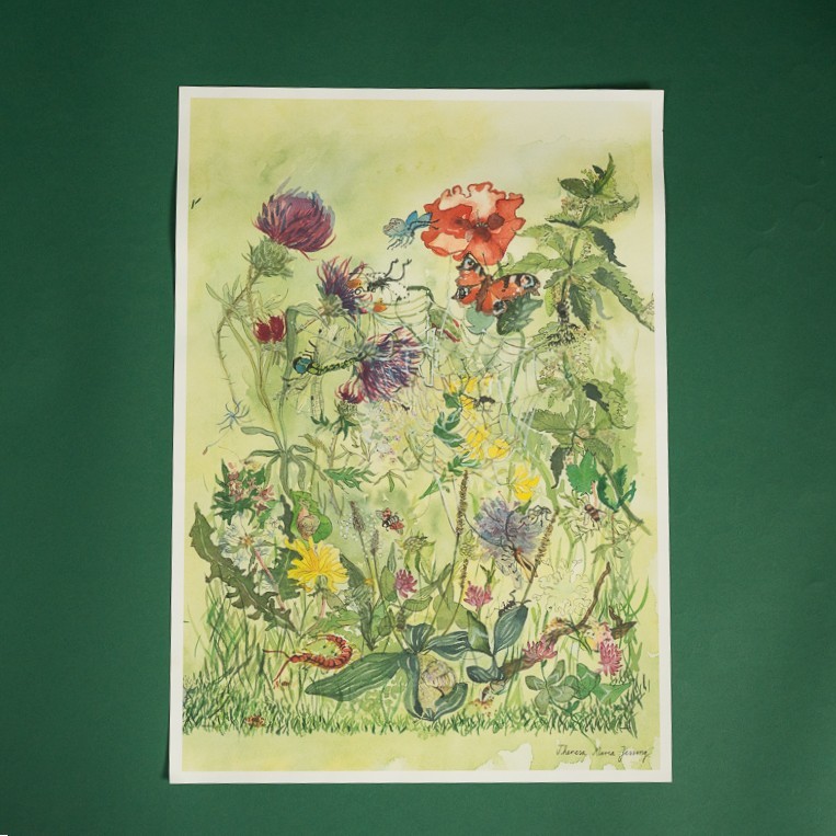 Nældens takvinge, brændenælde, lancetvejbred, mælkebøtte, valmue, blomsterfluer, mariehøner, snegle og bier. Livet myldrer i Theresa Maria Jessings vilde have, som udfolder sig på denne plakat.