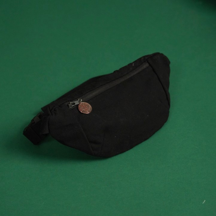 Sort bæltetaske i genanvendt bomuld og polyester har plads til alt, som du skal have med på farten. Tasken er rummelig og har plads til telefon, nøgler, en lille vandflaske og andre småting. I lynlåsen hænger der en nøglering med logo og Dyrenes Beskyttelses emblem. Bæltetasken har justerbar strop, der gør, at du både kan have den rundt om livet og over skulderen.