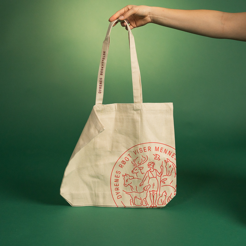 Dyrenes Beskyttelses emblem er trykt på både for-og bagside. Derudover er vores fine logo trykt på hanken af posen.