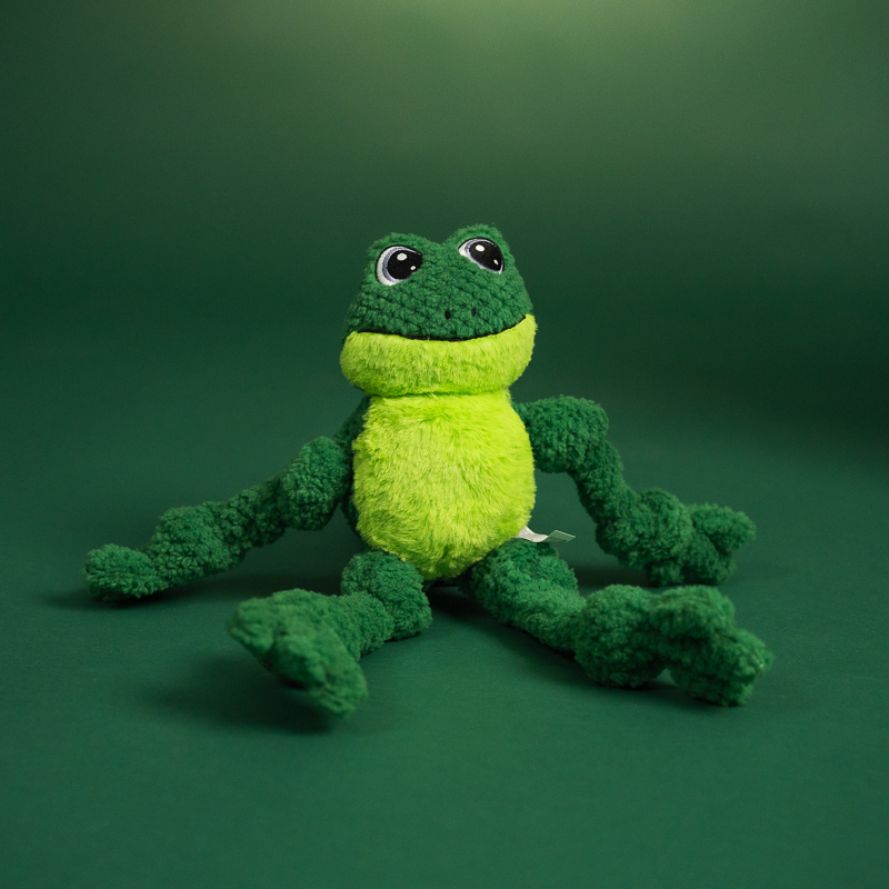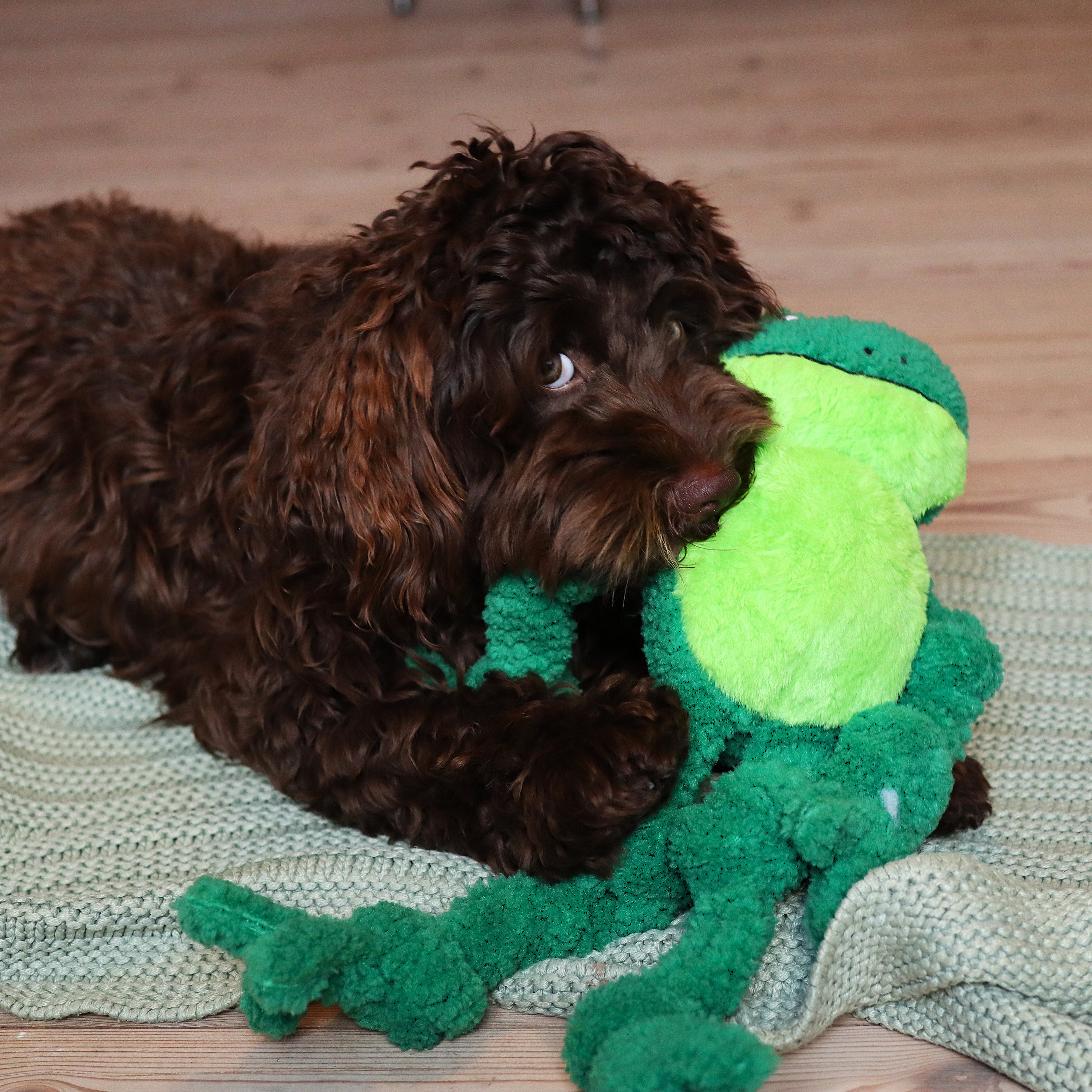 Frø knudebamse fra KONG byder på masser af sjov med sin store, flagrende krop, der indbyder til trækkeleg, tumlen og tyggeglæde. Det bløde dobbeltplys gør den ideel til både kram, samtidig med mens det indvendige reb-skelet giver ekstra styrke. Den indbyggede squeaker i hovedet vækker hundens nysgerrighed og holder legen i gang længere.