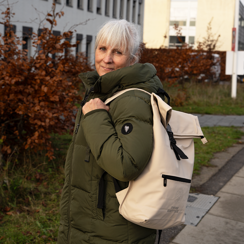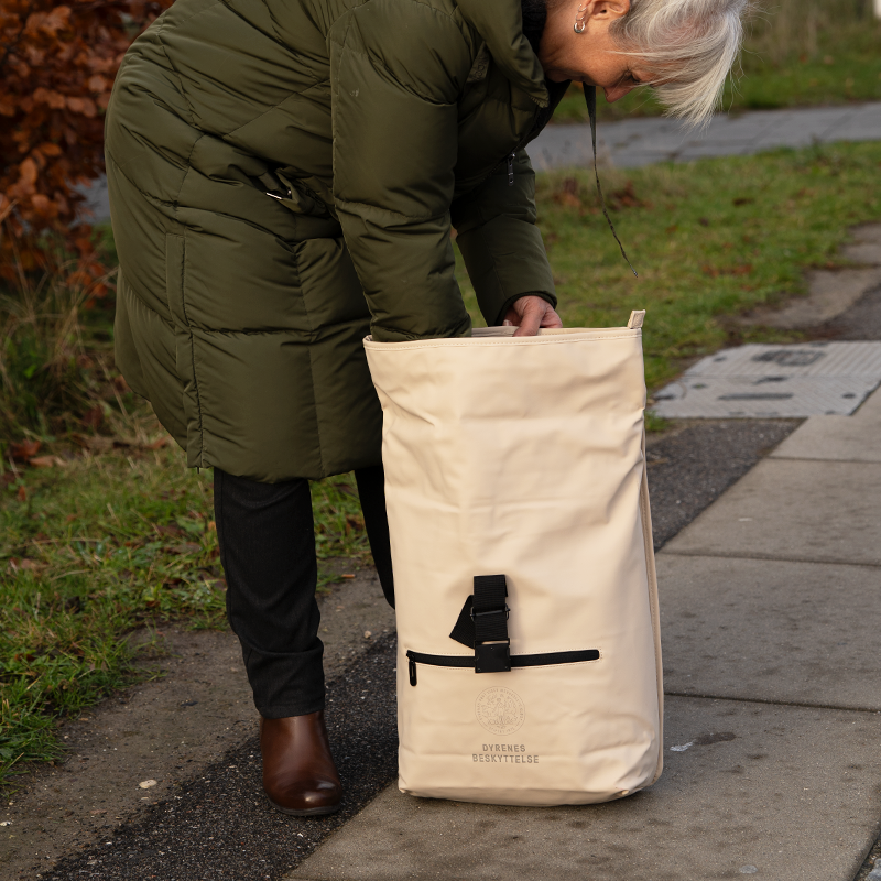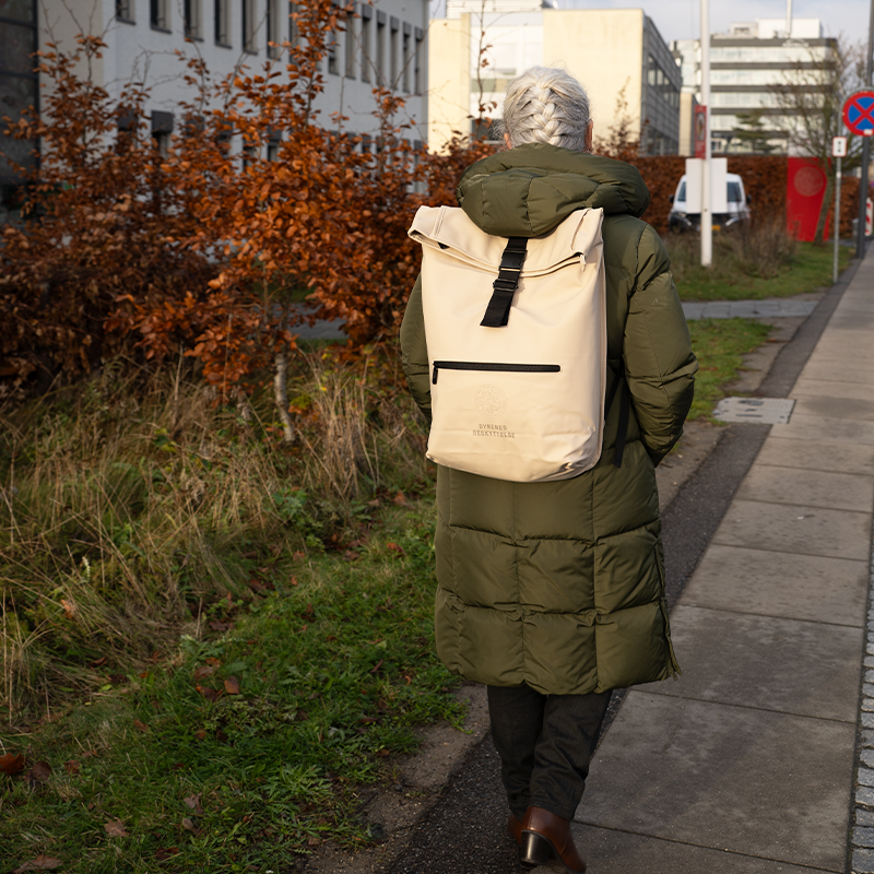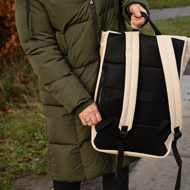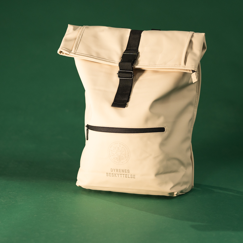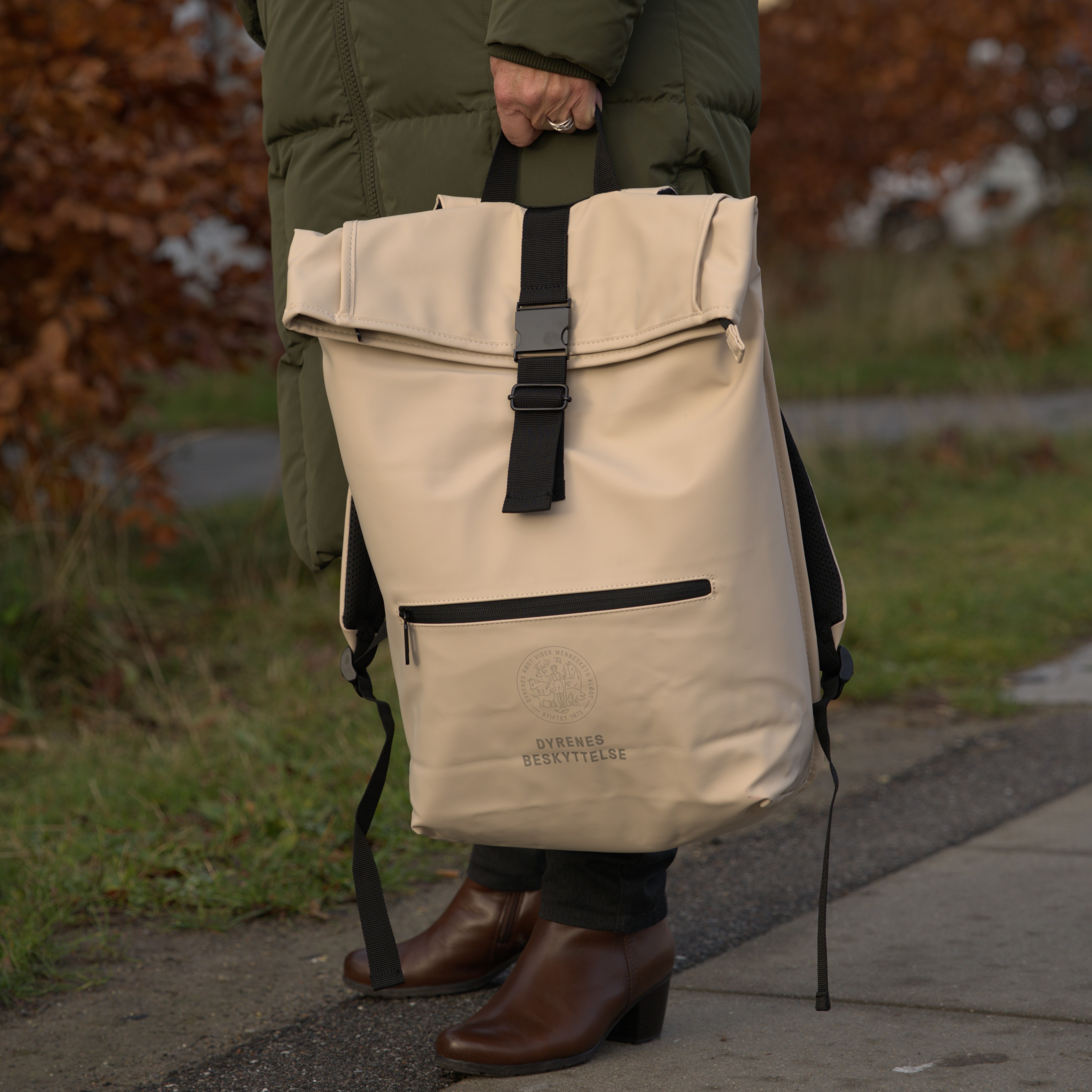 Elegant rygsæk i vandafvisende PU – perfekt til hverdag, studie og arbejde. Den smukke beige farve og Dyrenes Beskyttelses logo giver et stilrent udtryk. Rygsækken har separat rum til computer/notebook, forlomme til småting og en skjult baglomme. Det store rum kan rulles sammen og lukkes med spænde, så du nemt tilpasser pladsen i tasken.