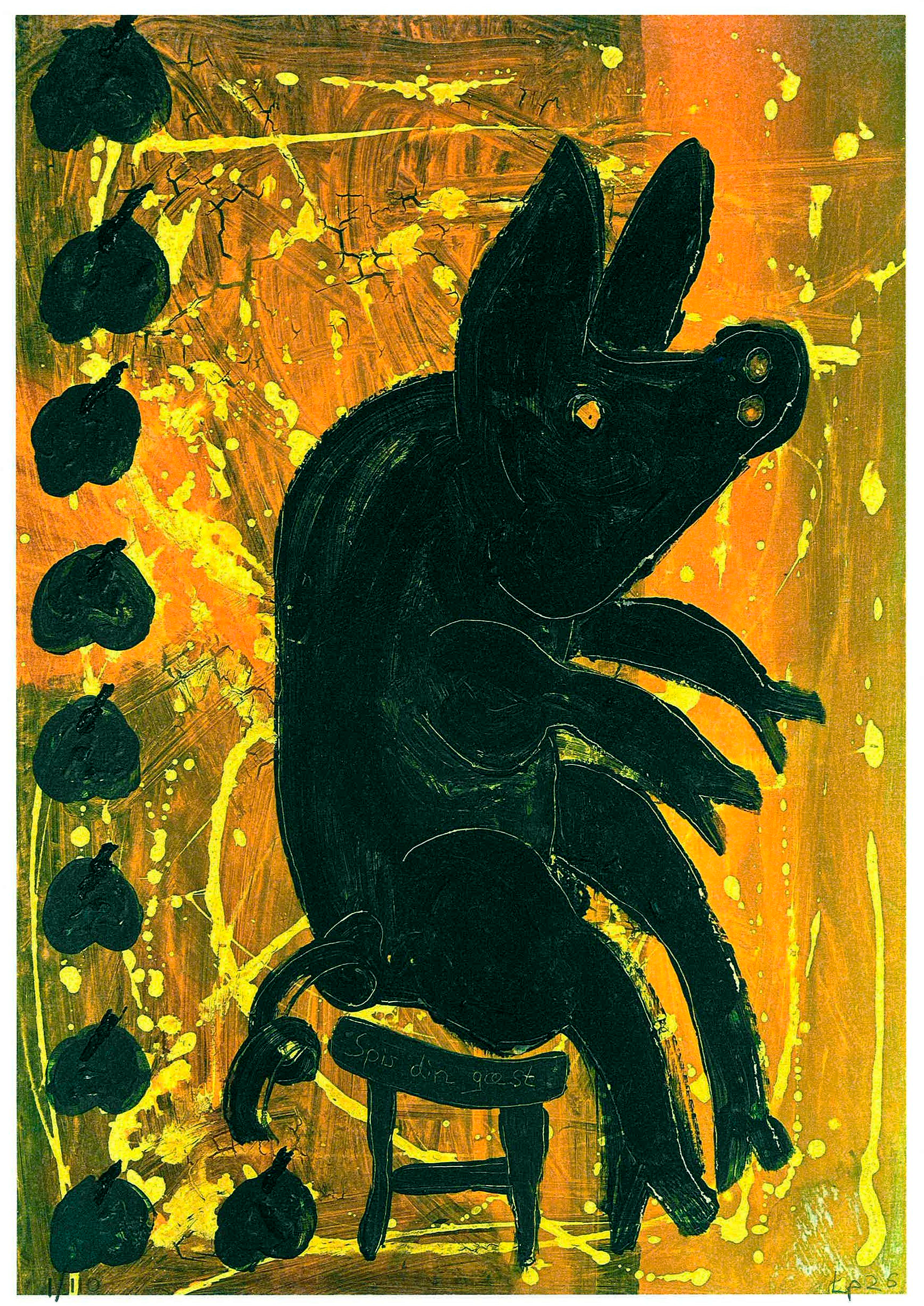 Æblerne vælter rundt som tegn på overflod uden omtanke, den gule baggrund pulser af kaos og forbrugsstøj, og grisen, presset op på en alt for lille skammel, viser hvor langt vi går for at få verden til at passe ind i vores egne rammer — uanset hvor absurde de er.